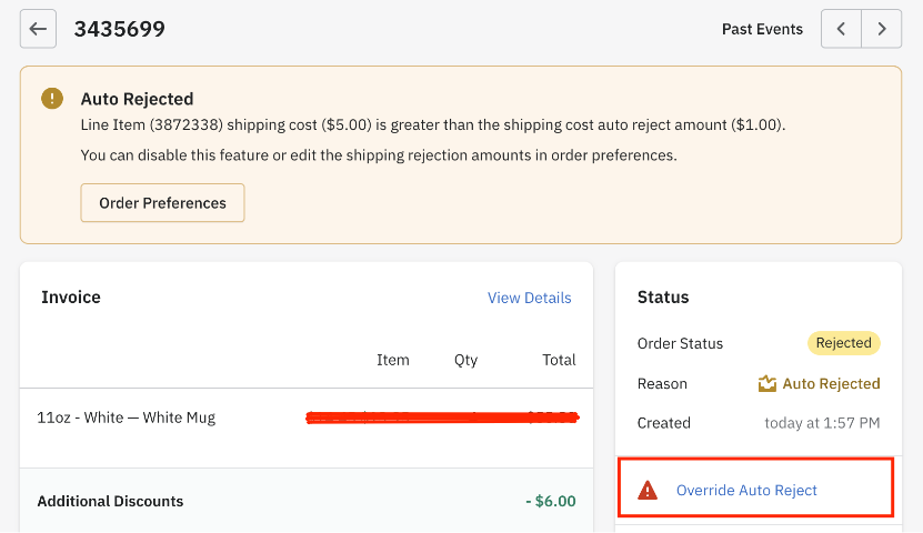 Note: You can override the Auto Reject. The order will then be submitted and processed as normal.