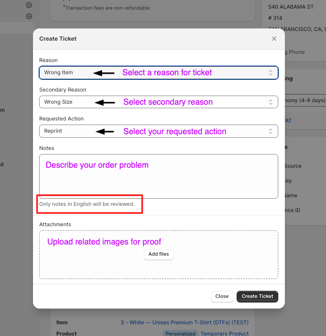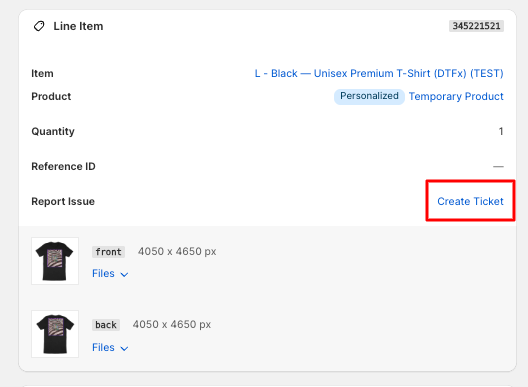 Step 2: Order > Fulfillment section > Create Ticket on the item related to the issue.
